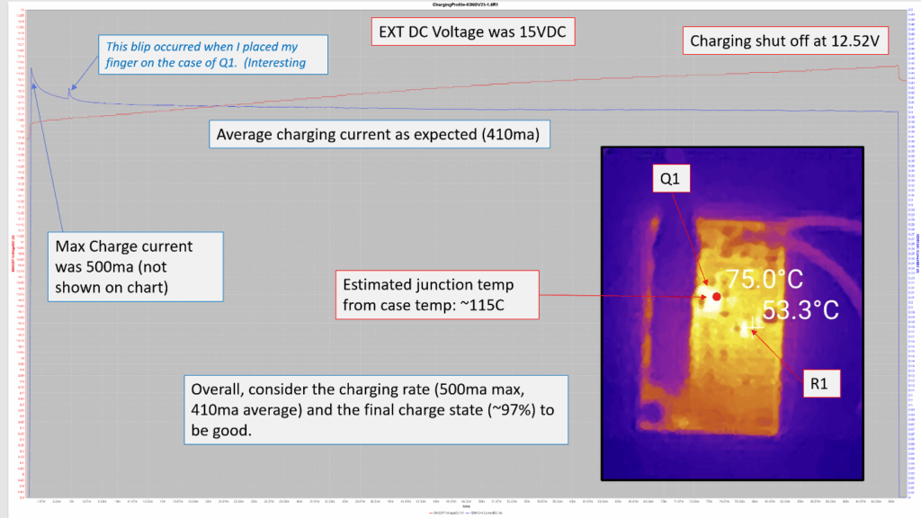The next rounds of testing added the use of thermal camera to monitor the PCB. The results of those tests showed R1 to be well within thermal limits and below it derating threshold value. Q1 was interestingly hot with a maximum case temperature of 77C and an average case temperature 75C over the charge cycle when the external charge voltage was at the maximum of 15VDC. The die junction temperature is estimated to about 115-125C. The datasheet lists a maximum die temperature rating of 150C so it closer than I would prefer but is acceptable. When charged at the typical vehicle and ham shack voltage of 13.8VDC, Q1 averaged over 15C cooler over the entire charge cycle. (If I do further revision to this PCB, I’ll look to improve the heatsinking of this component)