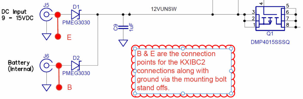 The E and B connections for the KXIBC2 design can be easily replicated in the KX3. The KX3 does not have the “OR” functionality between the external and battery sources. That can be replicated on the PCB design.